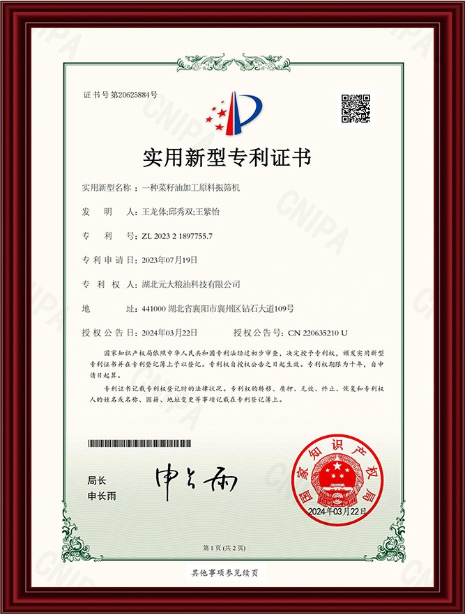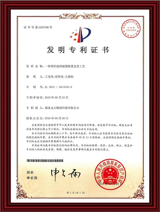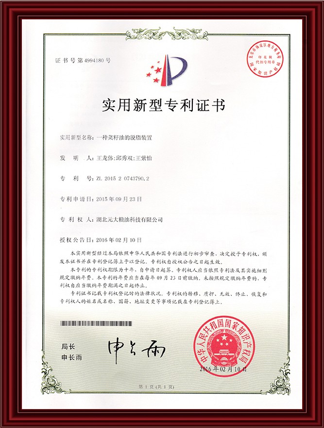实用新型专利-菜籽油的脱脂装置